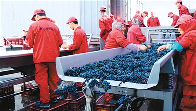 圖為摩洛哥一家酒莊的工人對葡萄進行清洗加工準備釀酒。葡萄酒將借首屆國際進博會來到中國。新華社記者 陳斌杰攝