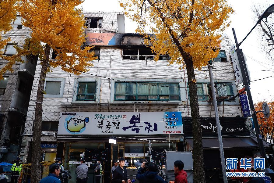 這是11月9日在韓國首爾拍攝的發生火災的建筑。 新華社記者王婧嬙攝