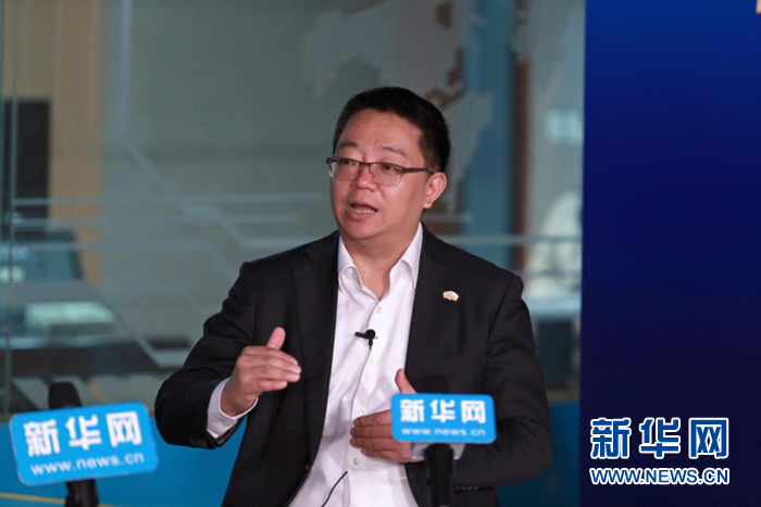圖為綠地商貿集團董事長、總經理薛迎杰接受新華網獨家專訪。新華網嚴曉瑜攝