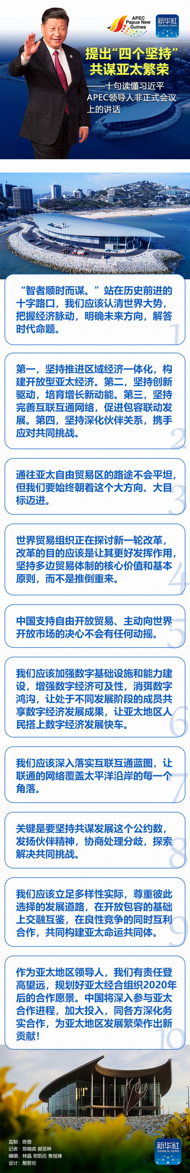 新華社莫爾茲比港11月18日電(記者鄭曉奕 郝亞琳)亞太經(jīng)合組織第二十六次領(lǐng)導(dǎo)人非正式會議18日在巴布亞新幾內(nèi)亞首都莫爾茲比港舉行,國家主席習(xí)近平出席并發(fā)表題為《把握時代機遇 共謀亞太繁榮》的重要講話。新華社為你劃重點摘金句。