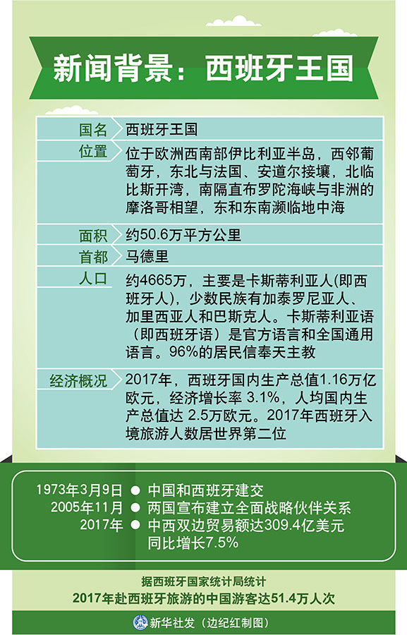 1973年3月9日,中國和西班牙建交。建交后,兩國在各領(lǐng)域的友好合作關(guān)系不斷發(fā)展。2005年11月,兩國宣布建立全面戰(zhàn)略伙伴關(guān)系。西班牙是歐盟國家中最早同中國建立全面戰(zhàn)略伙伴關(guān)系的國家之一。