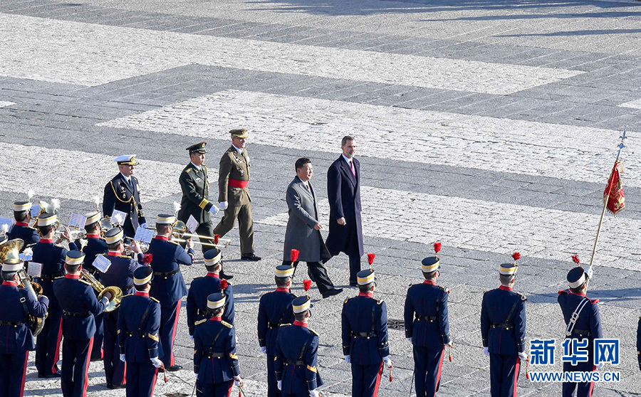 習近平和夫人彭麗媛乘皇家禮車在身著禮服、騎著高頭大馬的西班牙皇家衛隊騎兵護衛下,前往武器廣場。抵達時,鼓樂齊鳴,費利佩六世國王和萊蒂西婭王后上前迎接,互致問候。費利佩六世向習近平介紹王室高級官員。隨后,兩國元首夫婦一同登上檢閱臺。在21響禮炮聲中,軍樂團奏中國、西班牙兩國國歌。儀仗隊長趨前請習近平檢閱。習近平在費利佩六世國王陪同下依次檢閱步兵方隊、騎兵方隊和摩托車隊。習近平同西方陪同人員握手,費利佩六世國王同中方陪同人員握手。兩國元首夫婦返回檢閱臺,觀看分列式。在摩托車隊引領下,整齊的軍樂隊、雄赳赳的步兵方隊、威武的騎兵方隊依次通過檢閱臺。