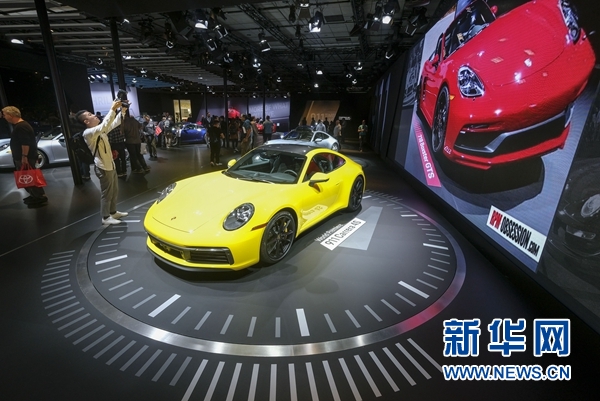 11月30日,在美國洛杉磯,人們在車展上參觀保時捷911卡雷拉4S。 新華社發(趙漢榮攝)
