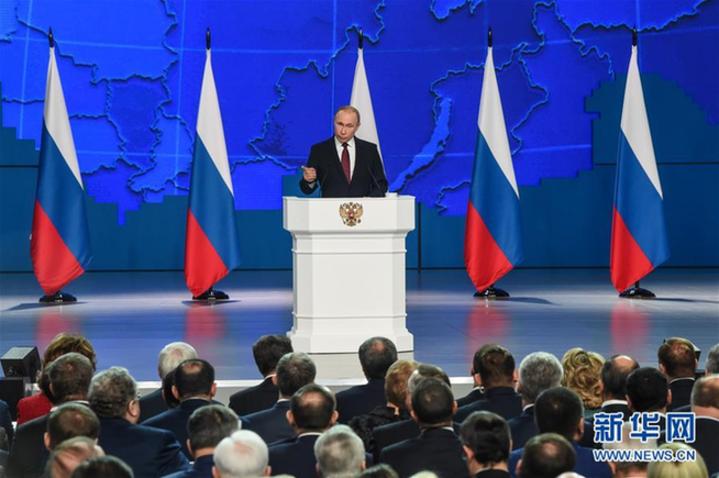 2月20日,在俄羅斯首都莫斯科,俄總統(tǒng)普京向議會上下兩院發(fā)表國情咨文。 新華社發(fā)(葉甫蓋尼·西尼岑攝)