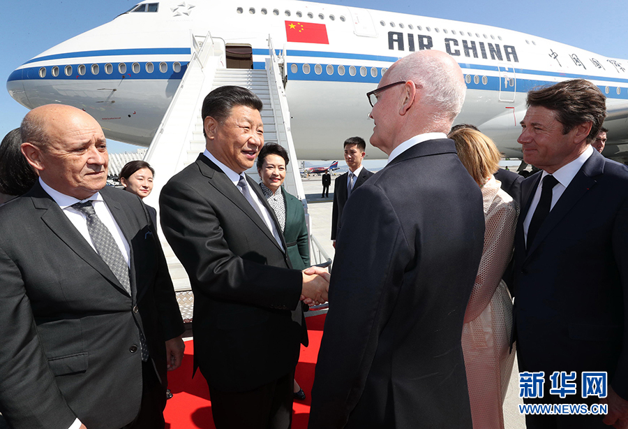當(dāng)?shù)貢r(shí)間中午12時(shí)許,習(xí)近平乘坐的專機(jī)抵達(dá)尼斯機(jī)場(chǎng)。習(xí)近平和夫人彭麗媛受到摩納哥政府首腦、國(guó)務(wù)大臣泰爾,摩納哥對(duì)外關(guān)系與合作大臣托內(nèi)利熱情迎接。法國(guó)外長(zhǎng)勒德里昂也到機(jī)場(chǎng)迎接。習(xí)近平和彭麗媛沿紅地毯前行,禮兵分列紅地毯兩側(cè),行注目禮。