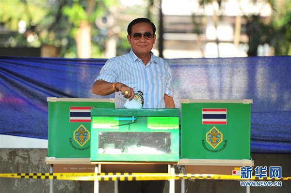 3月24日,泰國總理巴育在曼谷一個投票站投票。 泰國2014年軍事政變后的首次大選24日拉開帷幕,選舉委員會預計全國80%的選民將參加投票。正式結果將于5月9日前公布。 新華社發(拉亨 攝)