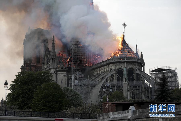 4月15日,在法國(guó)巴黎,巴黎圣母院燃起大火。 新華社發(fā)(亞歷山大·卡曼 攝)