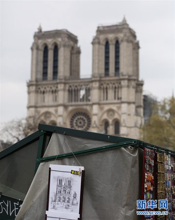 這是4月16日在法國(guó)巴黎拍攝的火災(zāi)后的巴黎圣母院以及書(shū)攤上售賣的圣母院圖片。法國(guó)總統(tǒng)馬克龍16日晚針對(duì)巴黎圣母院嚴(yán)重火災(zāi)發(fā)表簡(jiǎn)短電視講話,表示希望在五年內(nèi)重建巴黎圣母院。新華社記者 高靜 攝