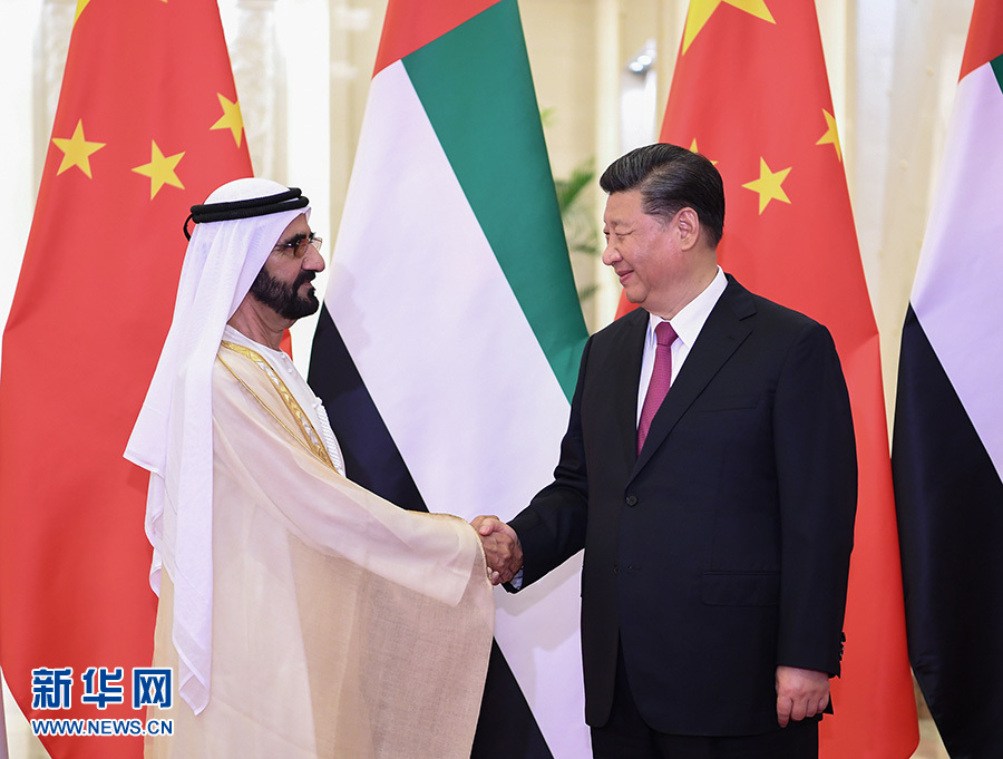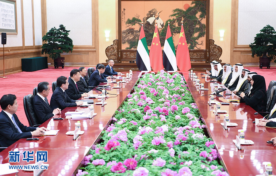 習(xí)近平指出,去年7月我訪問阿聯(lián)酋期間,兩國宣布建立全面戰(zhàn)略伙伴關(guān)系,揭開中阿關(guān)系發(fā)展新篇章。中方視阿聯(lián)酋為共建“一帶一路”的重要合作伙伴。雙方要穩(wěn)步推進(jìn)以能源合作為主軸、以投資和基礎(chǔ)設(shè)施建設(shè)為兩翼、以高新技術(shù)為增長點(diǎn)的務(wù)實(shí)合作。下階段要對接創(chuàng)新發(fā)展戰(zhàn)略,打造兩國合作新增長點(diǎn)。要深化打擊恐怖主義和極端勢力等安全領(lǐng)域合作,共同維護(hù)兩國和地區(qū)安全穩(wěn)定。副總統(tǒng)先生提出的“擁抱中國”計(jì)劃深受阿聯(lián)酋民眾歡迎,要不懈推動兩國人文交流。中方支持阿方明年舉辦中東地區(qū)首屆世博會。