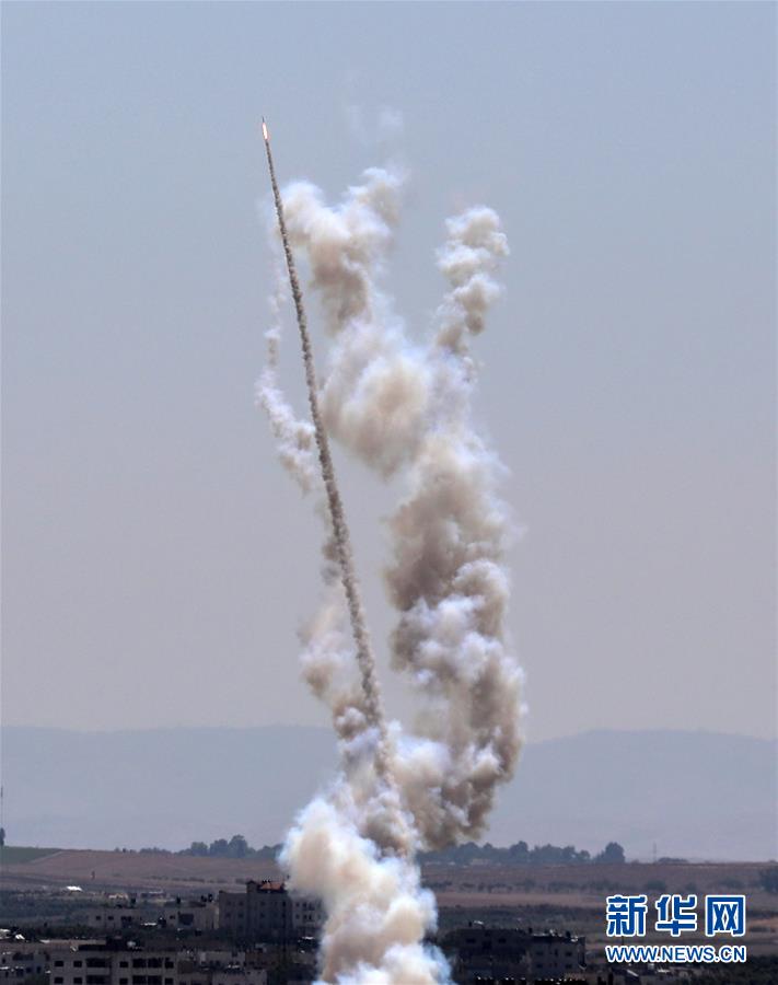 5月4日,一枚火箭彈從加沙地帶向以色列發射。新華社發(亞西爾 攝)