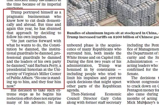 “他把自己描繪成一個(gè)務(wù)實(shí)的商人”,但是“他只是想做什么就做什么,憲法該死、制度該死、專業(yè)防護(hù)措施該死,”弗吉尼亞大學(xué)米勒公共事務(wù)中心的總統(tǒng)歷史學(xué)家芭芭拉·佩里說(shuō):“他所在黨派的領(lǐng)導(dǎo)人都很可惡,”“沒(méi)有人站起來(lái)對(duì)抗他,他們現(xiàn)在害怕他。”