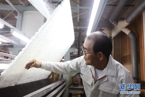 這是5月17日在日本和歌山縣,岡田織物現任社長岡田次弘挑選人造毛皮產品。新華社記者 杜瀟逸 攝
