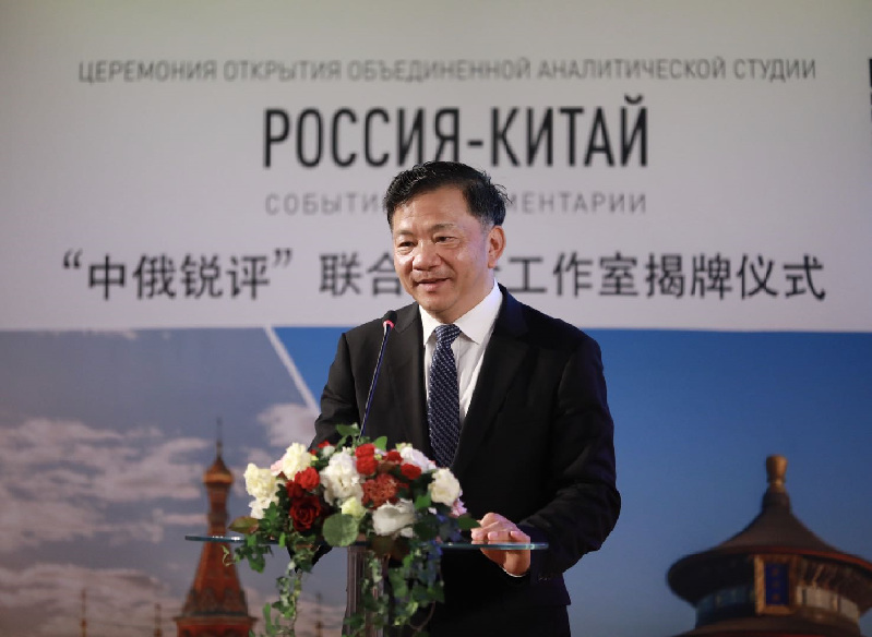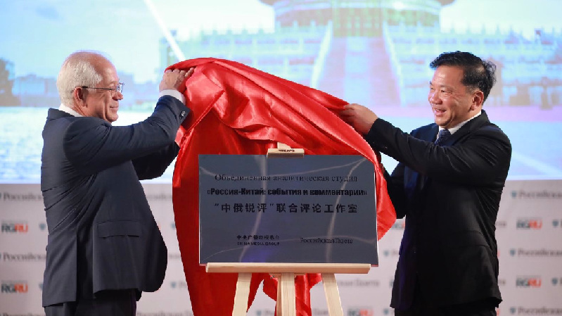 6月5日,由中央廣播電視總臺(tái)與俄羅斯政府機(jī)關(guān)報(bào)《俄羅斯報(bào)》共同打造的“中俄銳評(píng)”聯(lián)合評(píng)論工作室揭牌儀式在莫斯科舉行。中宣部副部長(zhǎng)、中央廣播電視總臺(tái)臺(tái)長(zhǎng)慎海雄,俄羅斯報(bào)社長(zhǎng)涅戈伊察出席儀式,并共同為“中俄銳評(píng)”聯(lián)合評(píng)論工作室揭牌。