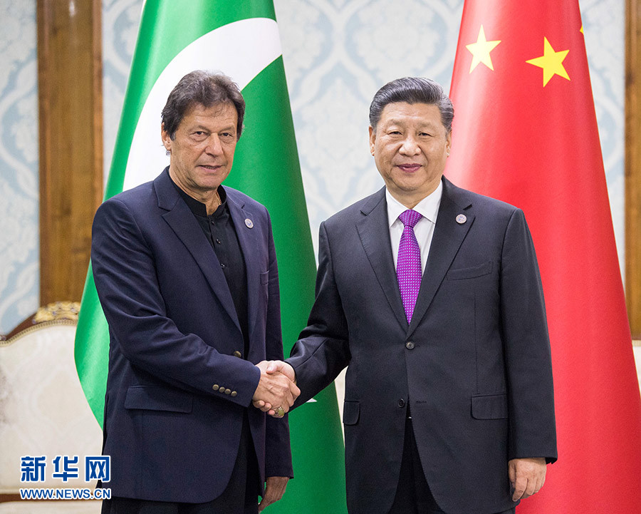 6月14日,國(guó)家主席習(xí)近平在比什凱克會(huì)見(jiàn)巴基斯坦總理伊姆蘭·汗。 新華社記者 李學(xué)仁 攝