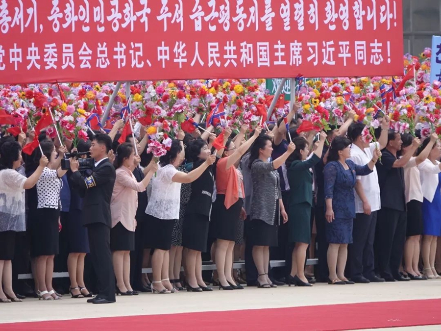 整座城市沉浸在熱情友好的氣氛之中。朝鮮最高領導人金正恩親赴機場迎接,平壤數十萬群眾沿途夾道歡迎,首次為外國領導人舉行致敬活動,習總書記在盛情之中正式開啟平壤時間。