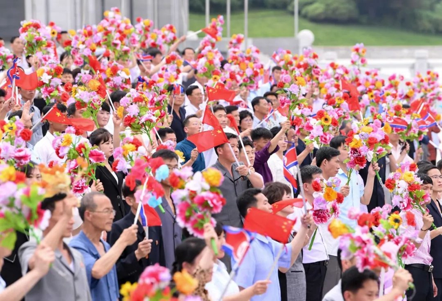 沿途數十萬群眾揮舞中朝兩國國旗和五彩繽紛的鮮花,熱情洋溢地高呼中朝友誼萬歲等口號。