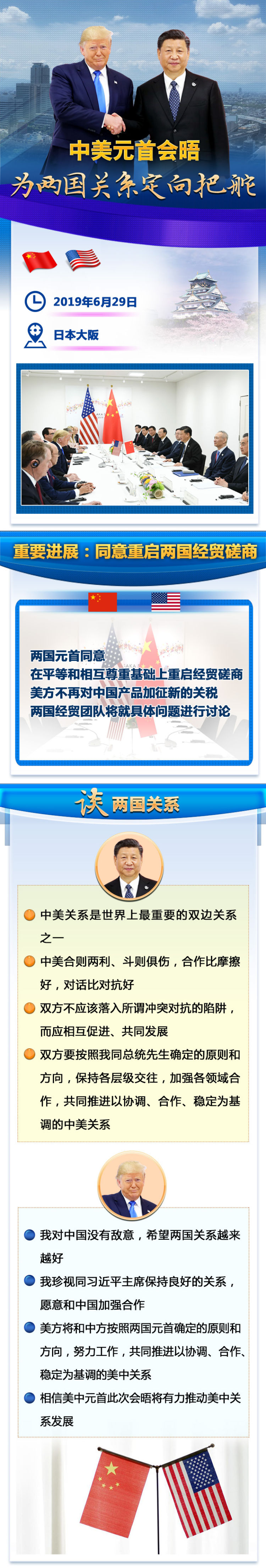 舉世矚目的中美元首會晤,于6月29日在日本大阪舉行。國家主席習(xí)近平同美國總統(tǒng)特朗普就事關(guān)中美關(guān)系發(fā)展的根本性問題、當(dāng)前中美經(jīng)貿(mào)摩擦以及共同關(guān)心的國際和地區(qū)問題深入交換意見,為下階段兩國關(guān)系發(fā)展定向把舵,同意推進以協(xié)調(diào)、合作、穩(wěn)定為基調(diào)的中美關(guān)系。