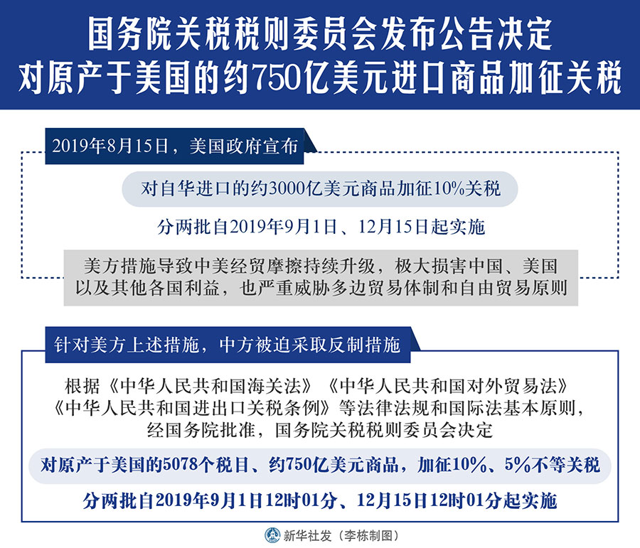 針對美方上述措施,中方被迫采取反制措施。根據《中華人民共和國海關法》《中華人民共和國對外貿易法》《中華人民共和國進出口關稅條例》等法律法規和國際法基本原則,經國務院批準,國務院關稅稅則委員會決定,對原產于美國的5078個稅目、約750億美元商品,加征10%、5%不等關稅,分兩批自2019年9月1日12時01分、12月15日12時01分起實施。