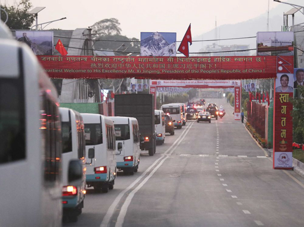 10月12日,尼泊爾首都加德滿都,車隊經過一道道迎賓拱門。新華社記者丁林攝