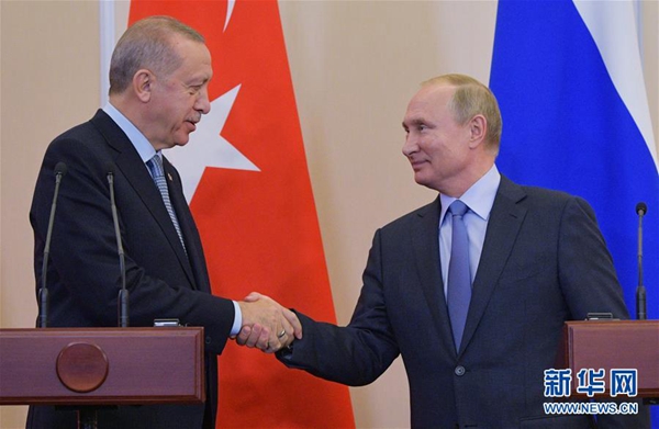 10月22日,在俄羅斯索契,俄羅斯總統普京(右)聆聽到訪的土耳其總統埃爾多安講話。新華社/衛星社