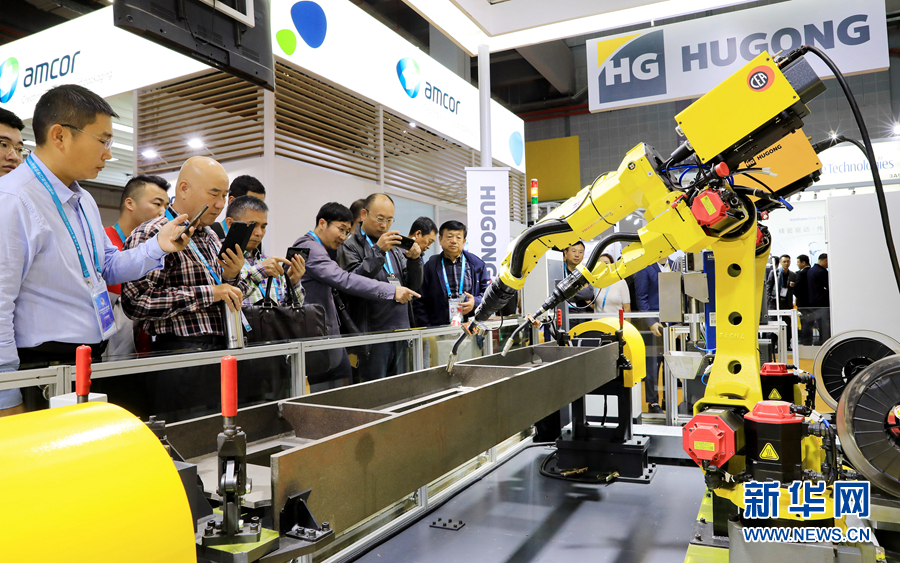 11月6日,在進博會裝備展區,一組正在進行作業演示的焊接機器人吸引了參觀者的目光。當日是第二屆中國國際進口博覽會開幕第二天,上海國家會展中心迎來首個“大客流”。新華社記者 方喆 攝