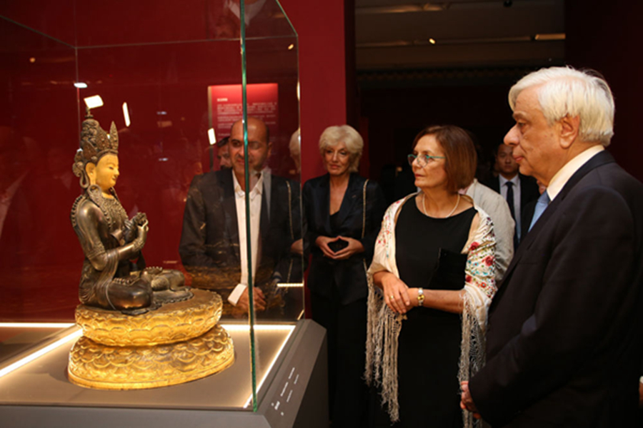 2018年9月14日,在希臘首都雅典衛城博物館,希臘總統帕夫洛普洛斯(右)在“重文德之光華:重華宮原狀文物展”上參觀。這是來自中國故宮博物院的154件清朝乾隆時期珍貴文物首次出國展出。新華社發(馬里奧斯·羅洛斯攝)