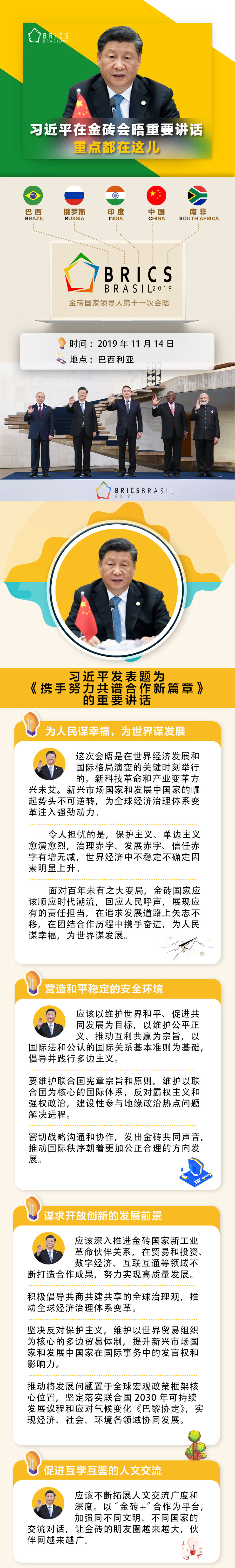當地時間11月14日,金磚國家領導人第十一次會晤在巴西首都巴西利亞舉行。巴西總統博索納羅主持會晤。中國國家主席習近平、俄羅斯總統普京、印度總理莫迪、南非總統拉馬福薩出席。習近平發表題為《攜手努力共譜合作新篇章》的重要講話。當天,金磚國家領導人還舉行閉門會議,習近平在會上發表重要講話。