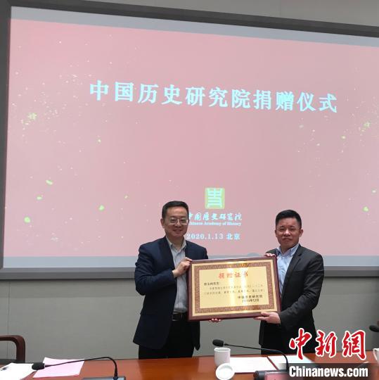 中國社科院副院長、黨組成員,中國歷史研究院院長、黨委書記高翔為陳玉樹頒發(fā)捐贈證書。 冉文娟 攝