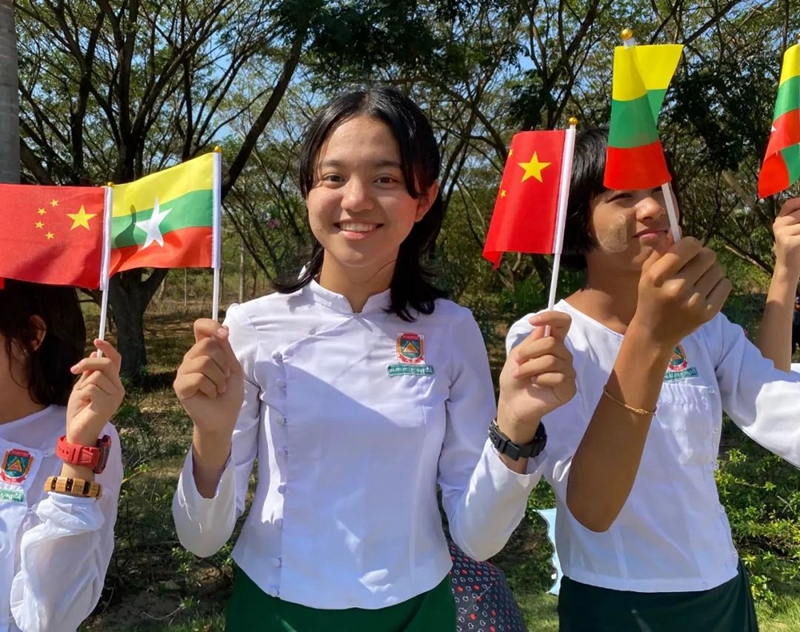 暖陽下,中緬兩國國旗招展。