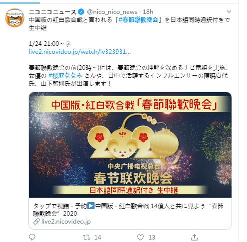 2020年1月24日晚,日本將在線直播中國(guó)春晚。來(lái)源:日本視頻網(wǎng)站niconico官方社交媒體賬戶截圖