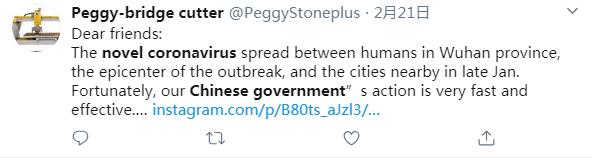 推特用戶Peggy-bridge cutter說(shuō):親愛的朋友們,新冠肺炎疫情在武漢和周邊城市暴發(fā)。所幸,中國(guó)政府采取了迅速、有效的行動(dòng)。