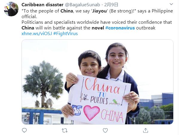 推特用戶Caribbean disaster說(shuō):一名菲律賓官員表示,想要對(duì)中國(guó)人民說(shuō),你們加油。世界各地的政治家和專家紛紛表示,對(duì)中國(guó)戰(zhàn)勝新冠疫情很有信心。(作者: 嚴(yán)玉潔 資料來(lái)源:新華社、央視網(wǎng)、人民網(wǎng)、國(guó)際在線等)