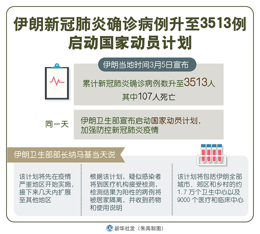 新華社德黑蘭3月5日電(記者陳霖)伊朗5日宣布累計新冠肺炎確診病例數升至3513人。同一天,伊朗衛生部宣布啟動國家動員計劃,加強防控新冠肺炎疫情。
