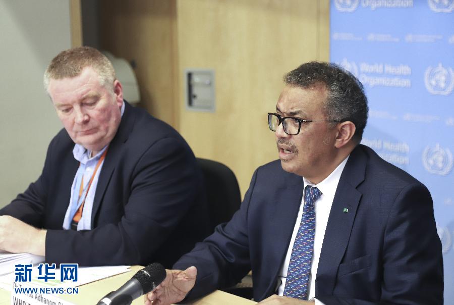 3月5日,在瑞士日內瓦,世界衛生組織總干事譚德塞(右)在世衛組織例行記者會上發言。世界衛生組織總干事譚德塞5日呼吁,各國應調動并協調政府各部門間的行動,以“全政府”參與的方式應對新冠肺炎疫情。 新華社記者 陳俊俠 攝
