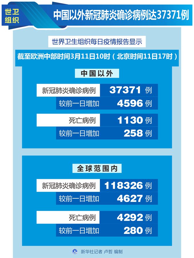 世衛(wèi)組織每日疫情報告顯示,截至歐洲中部時間11日10時(北京時間11日17時),中國以外新冠肺炎確診病例較前一日增加4596例,達(dá)到37371例;中國以外死亡病例較前一日增加258例,達(dá)到1130例。
