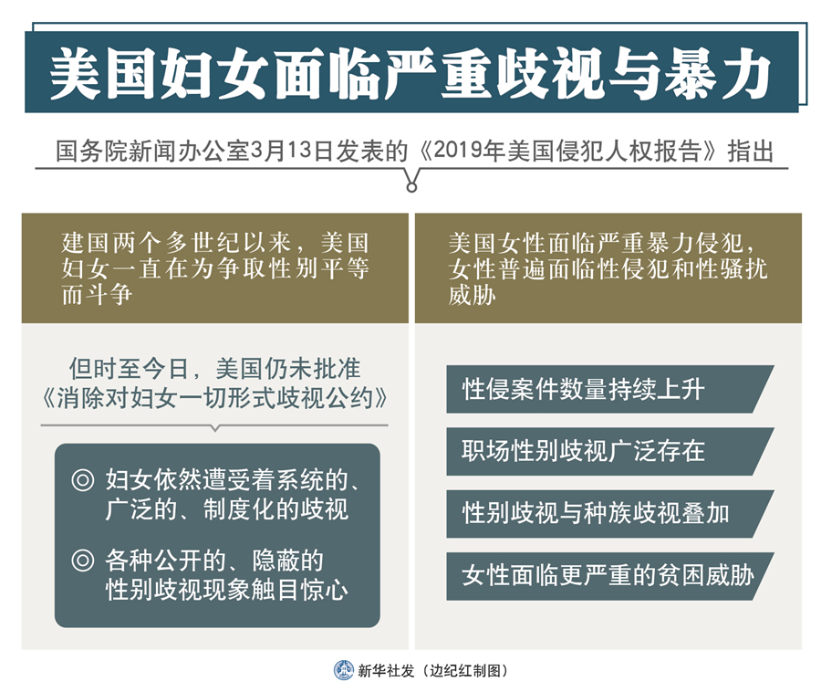 新華社北京3月13日電(記者王鵬、張云龍)國務院新聞辦13日發表的《2019年美國侵犯人權報告》指出,美國婦女面臨嚴重歧視與暴力。