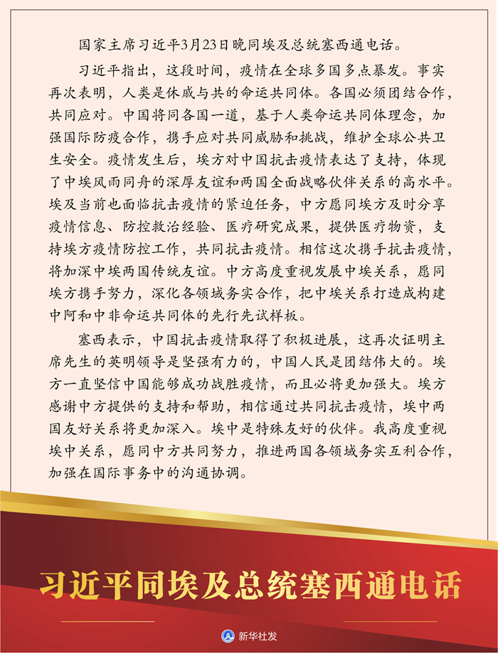 習近平指出,這段時間,疫情在全球多國多點暴發。事實再次表明,人類是休戚與共的命運共同體。各國必須團結合作,共同應對。中國將同各國一道,基于人類命運共同體理念,加強國際防疫合作,攜手應對共同威脅和挑戰,維護全球公共衛生安全。疫情發生后,埃方對中國抗擊疫情表達了支持,體現了中埃風雨同舟的深厚友誼和兩國全面戰略伙伴關系的高水平。埃及當前也面臨抗擊疫情的緊迫任務,中方愿同埃方及時分享疫情信息、防控救治經驗、醫療研究成果,提供醫療物資,支持埃方疫情防控工作,共同抗擊疫情。相信這次攜手抗擊疫情,將加深中埃兩國傳統友誼。中方高度重視發展中埃關系,愿同埃方攜手努力,深化各領域務實合作,把中埃關系打造成構建中阿和中非命運共同體的先行先試樣板。