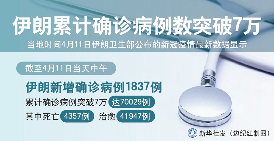 新華社德黑蘭4月11日電(記者陳霖)伊朗衛生部11日公布的新冠疫情最新數據顯示,截至當天中午,伊朗新增確診病例1837例,累計確診病例突破7萬,達70029例,其中死亡4357例,重癥3987例,治愈41947例。