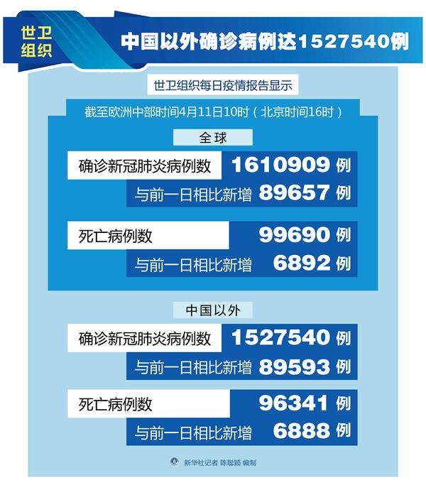 世衛(wèi)組織每日疫情報(bào)告顯示,截至歐洲中部時(shí)間11日10時(shí)(北京時(shí)間16時(shí)),中國(guó)以外新冠確診病例較前一日增加89593例,達(dá)到1527540例;中國(guó)以外死亡病例較前一日增加6888例,達(dá)到96341例。