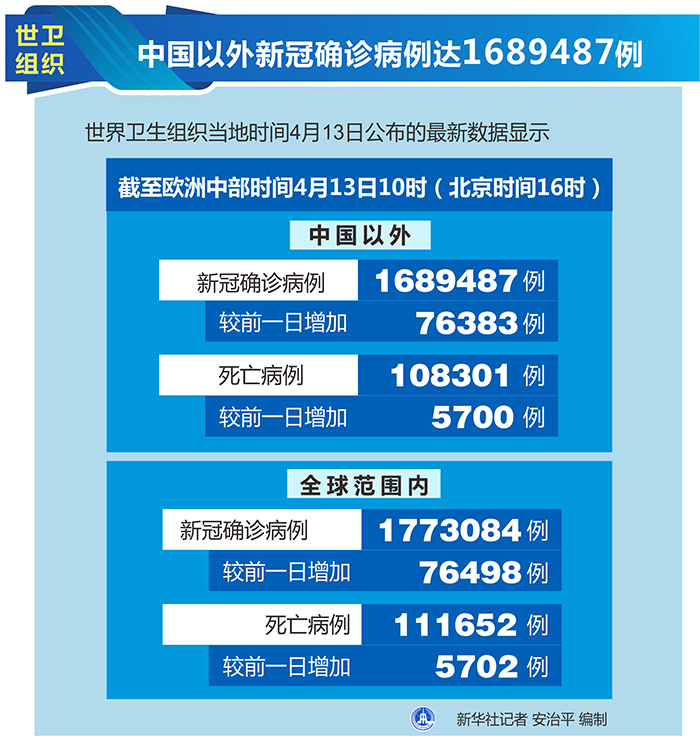 新華社日內瓦4月13日電(記者劉曲)世界衛生組織13日公布的最新數據顯示,中國以外新冠確診病例達到1689487例。