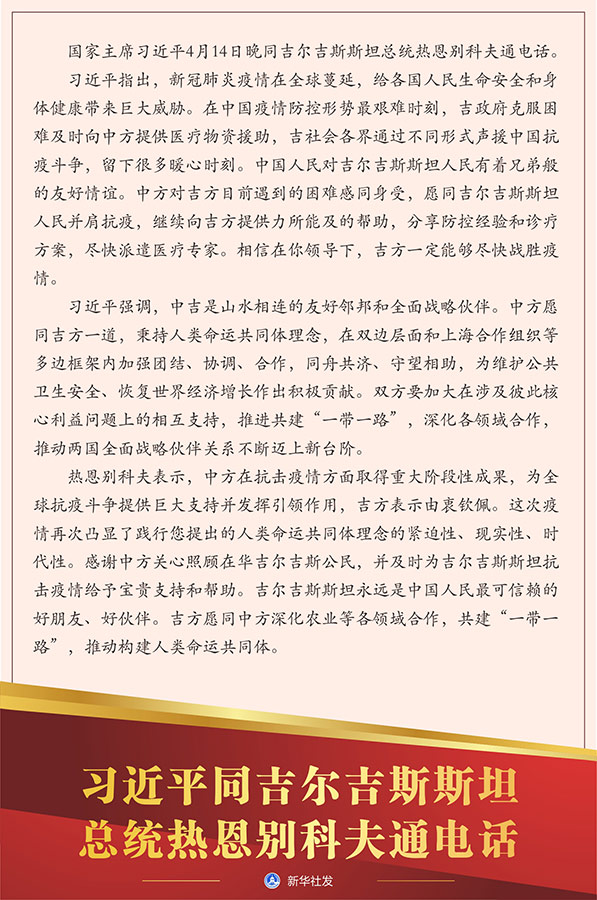 習(xí)近平指出,新冠肺炎疫情在全球蔓延,給各國(guó)人民生命安全和身體健康帶來(lái)巨大威脅。在中國(guó)疫情防控形勢(shì)最艱難時(shí)刻,吉政府克服困難及時(shí)向中方提供醫(yī)療物資援助,吉社會(huì)各界通過(guò)不同形式聲援中國(guó)抗疫斗爭(zhēng),留下很多暖心時(shí)刻。中國(guó)人民對(duì)吉爾吉斯斯坦人民有著兄弟般的友好情誼。中方對(duì)吉方目前遇到的困難感同身受,愿同吉爾吉斯斯坦人民并肩抗疫,繼續(xù)向吉方提供力所能及的幫助,分享防控經(jīng)驗(yàn)和診療方案,盡快派遣醫(yī)療專家。相信在你領(lǐng)導(dǎo)下,吉方一定能夠盡快戰(zhàn)勝疫情。