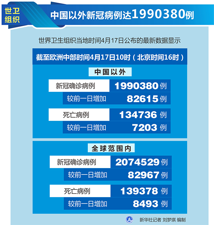 新華社日內瓦4月17日電(記者劉曲)世界衛生組織17日公布的最新數據顯示,中國以外新冠確診病例達到1990380例。