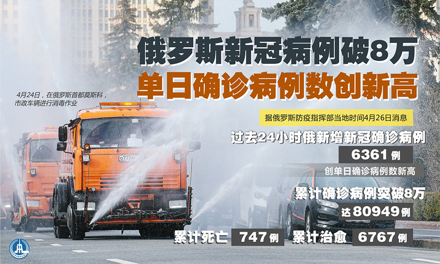 新華社莫斯科4月26日電(記者魯金博)據俄羅斯防疫指揮部26日消息,過去24小時俄新增新冠確診病例6361例,創單日確診病例數新高,累計確診病例突破8萬,達80949例。