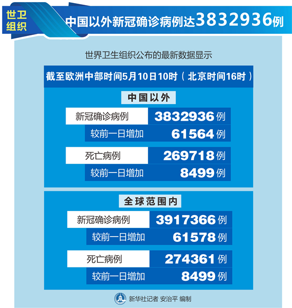 世衛(wèi)組織每日疫情報告顯示,截至歐洲中部時間10日10時(北京時間16時),中國以外新冠確診病例較前一日增加61564例,達到3832936例;中國以外死亡病例較前一日增加8499例,達到269718例。