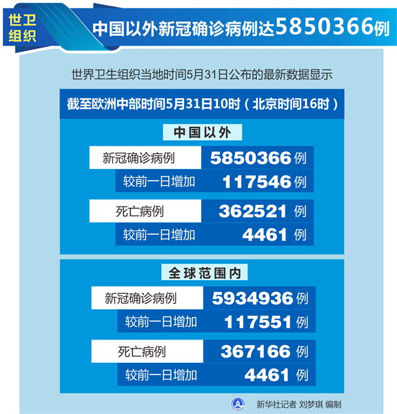 新華社日內瓦5月31日電(記者劉曲)世界衛生組織31日公布的最新數據顯示,中國以外新冠確診病例達到5850366例。