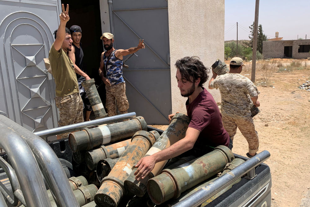 6月5日,利比亞民族團結政府武裝人員在奪回泰爾胡奈市后搬運沒收的武器。(新華社/路透)