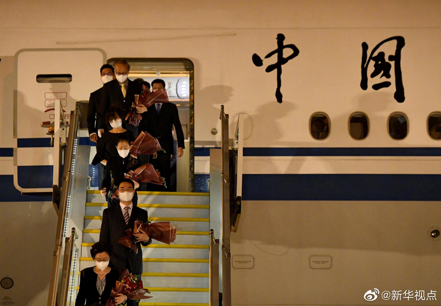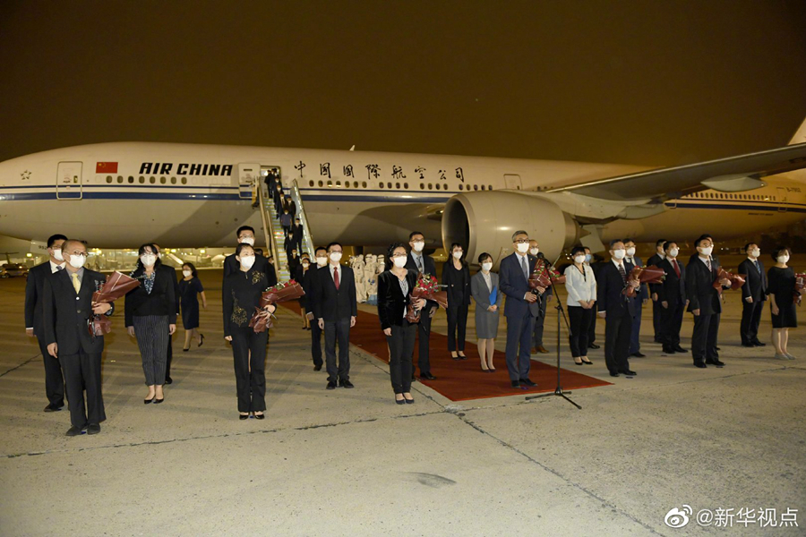 8月17日晚,中國駐休斯敦總領(lǐng)事館全體館員乘包機抵達北京,外交部在首都機場舉行簡短莊重迎接儀式。(記者成欣、岳月偉) ????