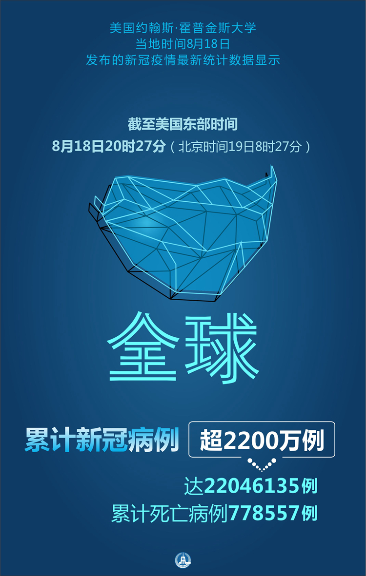 新華社紐約8月18日電? 美國約翰斯·霍普金斯大學(xué)18日發(fā)布的新冠疫情最新統(tǒng)計數(shù)據(jù)顯示,截至美國東部時間18日20時27分(北京時間19日8時27分),全球累計確診病例突破2200萬例,達(dá)22046135例,累計死亡病例778557例。