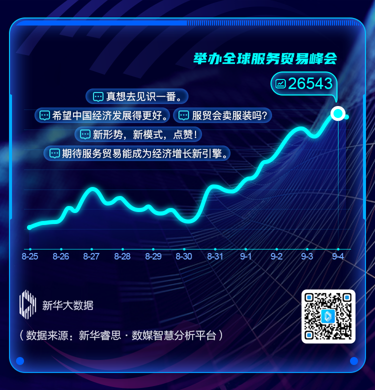 9月4日,2020年中國國際服務(wù)貿(mào)易交易會(簡稱服貿(mào)會)在北京開幕。作為疫情發(fā)生以來我國在線下舉辦的第一場重大國際經(jīng)貿(mào)活動,服貿(mào)會受到輿論廣泛關(guān)注,話題信息量不斷增加,網(wǎng)絡(luò)討論熱度更是高達96.57,位居話題熱度榜首。不少網(wǎng)民表示“真想去見識一番”“新形勢、新模式,點贊!”“期待服務(wù)貿(mào)易能成為經(jīng)濟增長新引擎”。但面對鋪天蓋地的服貿(mào)會相關(guān)信息,也有部分網(wǎng)民表示“疑惑”,“服貿(mào)會賣服裝嗎?”“服貿(mào)會上都展出什么服務(wù)呢?”……