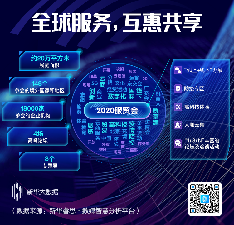 今年展會包括了1個綜合展、8個專題展及若干功能服務(wù)區(qū)。其中綜合展包括公共衛(wèi)生防疫專區(qū)、國別和省(自治區(qū)、直轄市)專區(qū)、服務(wù)貿(mào)易十二大領(lǐng)域企業(yè)專區(qū);專題展則突出打造文化、金融、冬季運動、旅游、教育、體育、服務(wù)機器人和5G通信服務(wù)等服務(wù)領(lǐng)域行業(yè)特色。